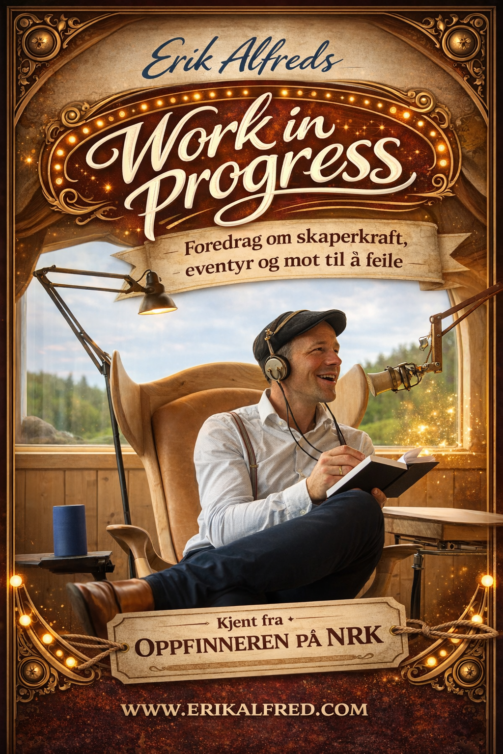 Bli med når Erik Alfred – kjent fra NRK-serien Oppfinneren – inviterer små og store inn i en verden der fantasi og virkelighet møtes, og alt kan bygges om du bare tør å prøve! Her får publikum ikke bare se, men også være med på å skape: vi bygger oppfinnelser sammen, tester mekaniske påfunn og får tips og triks fra et langt oppfinnerliv.